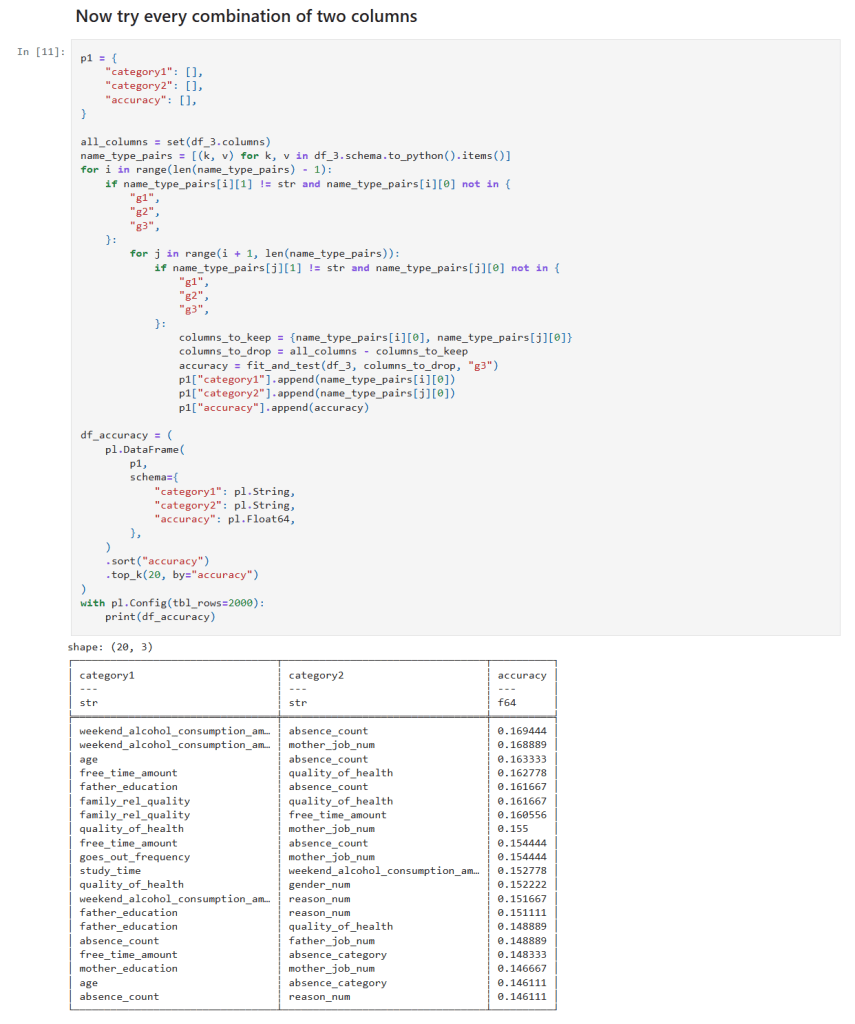 - Two-Feature Combinations: By testing all pairs, I noticed that combinations including weekend alcohol consumption appeared in the top 20 predictive pairs four times, including in both of the top two.