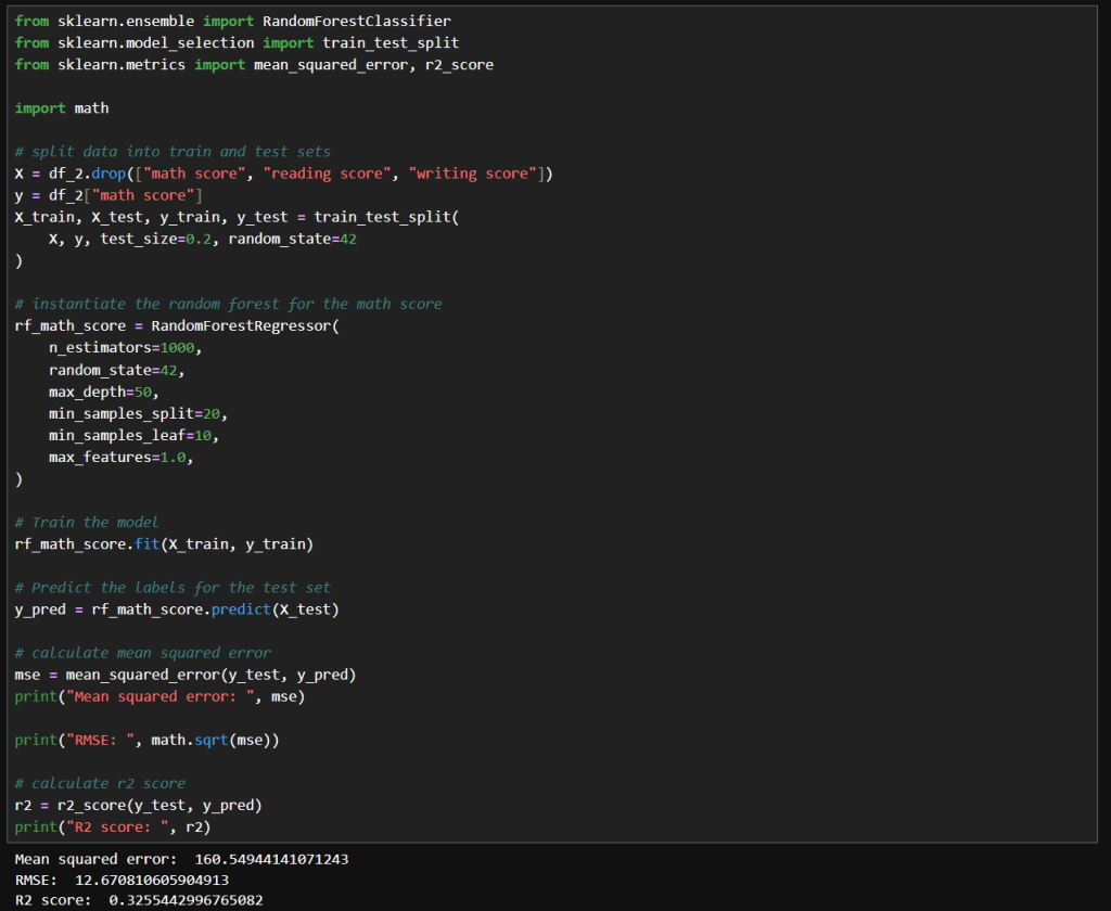 In this cell, I’ve replaced the math score data a winsorized version. I used the same hyperparameters as before. Here we can see a more significant improvement MSE and RMSE, but a slightly lower R² score.